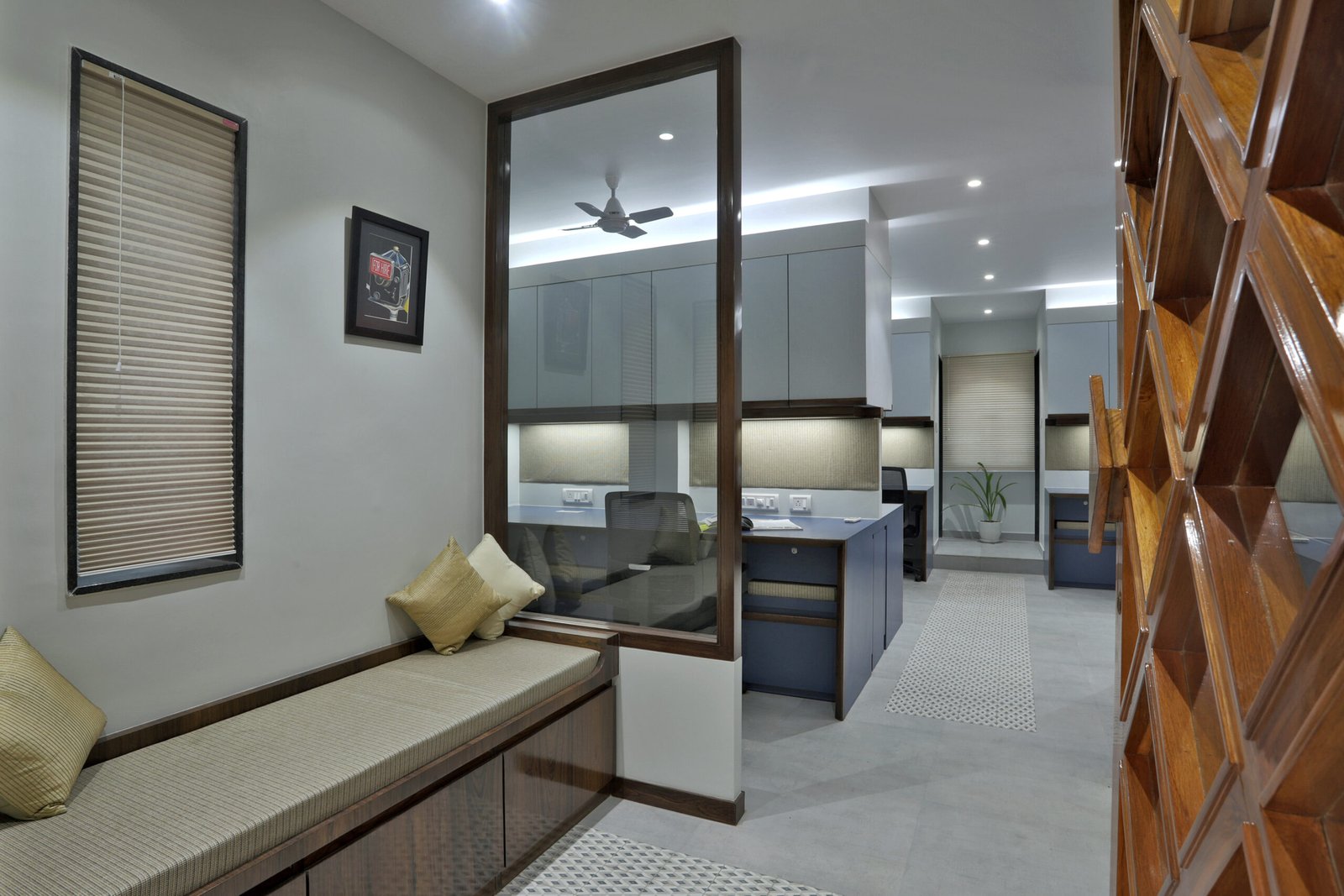A rejuvenation project for an established structural design firm. The design attempts to exemplify the ethos of firm with clean lines and structured movement pattern in planning with improved in house facilities.The warm wooden tones and accent lighting achieved in the final outcome aims to capture the 19 years of countless projects and hard work.